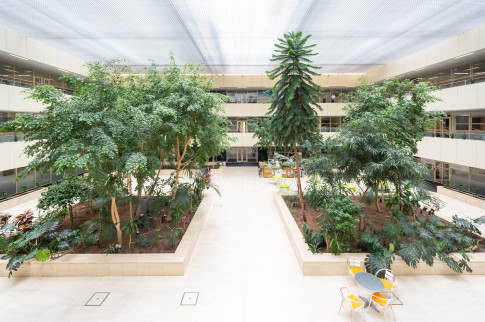 In a modern building that has an impressive mixed-use lobby with open walkways giving an impression of space and grandeur.